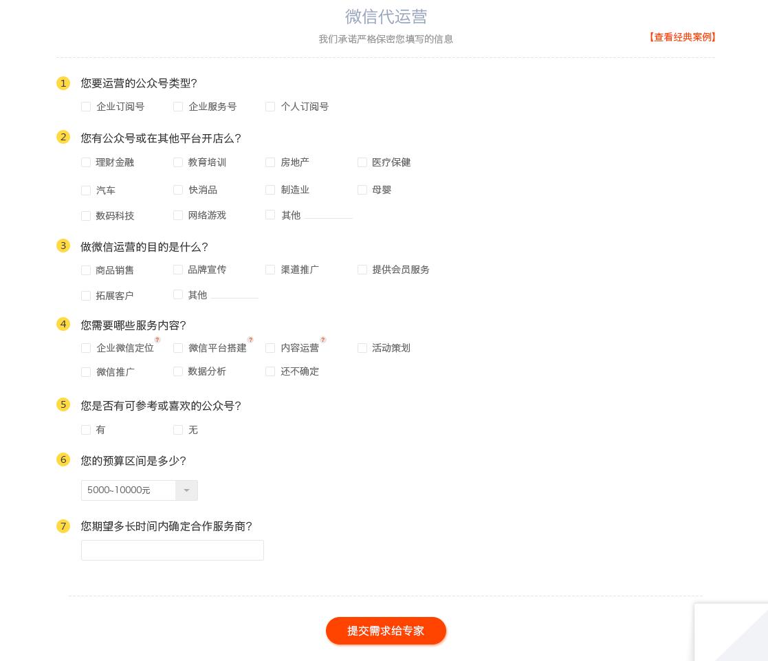 其一,客户需求的标准化。甲方客户找到平台时,会有专门的客服和其对接,整理客户需求,帮他们理清楚到底想要什么。最为关键的一点,会录入客户数据。无论是最终成交的用户,还是单纯来询问的企业,客服都会一五一十的将他们的问题记录下来,把所问的问题存到后台。将客户需求体系化、系统化和标准化。如下图所示。当数据累计到一定的量级后,就可以去掉客服,客户进来时只需填表,需求即可被清楚直白的显现出来。