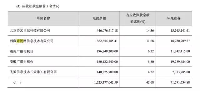 截止目前乐视在华策应收账款金额前 5 名中排名第二位,欠款高达3.6亿元,占总欠款的11.68%。