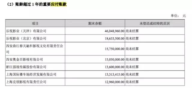 乐视网2016年财报中显示,账龄超过 1 年的重要应付账款前五家公司中有四家公司是影视传媒类公司:包括了乐视影业、西安曲江春天融和影视文化有限责任公司、西安奥金百影视有限公司、浙江强视传媒股份有限公司(道博股份子公司)以及上海克顿影视有限责任公司(华策影视旗下子公司)。
