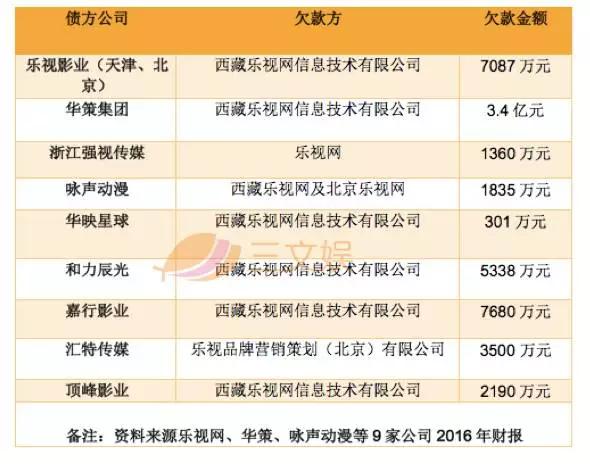 编者按:本文来自微信公众号“三文娱”(ID:hi3wyu),作者 BB酱;36氪经授权发布,转载请联系原出处。原题目《华策3.4亿、嘉行7680万、和力辰光5338万、咏声动漫1835万:乐视还欠影视公司多少债?》