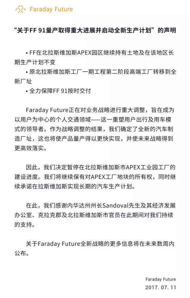 随后贾跃亭转发了该声明,并表示为保障产品按时交付,FF91 高端工厂将迁至新厂址,并全力改造现有厂房和推进设备采购,尽快实现量产,同时继续保有北拉斯维加斯 APEX 工厂地块,建设计划由三期调整为两期。