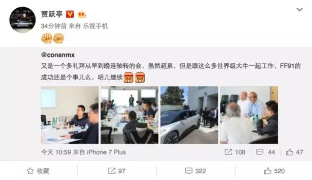 贾总在微博转发了同事拍摄的「工作照」,和 Faraday Future 公司研发和工程高级副总裁 Nick Sampson 等坐在一起,是在讨论代工的事宜吗?