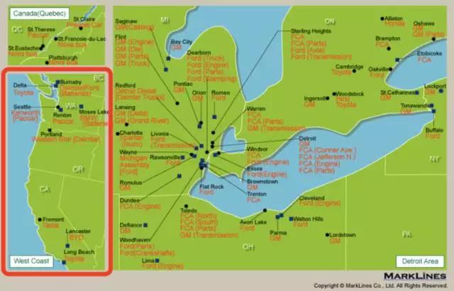 这句话勾起了我的好奇心,工作不饱和的我先查了查美国西海岸周边已有的整车制造厂,想看看能不能找到非常合适,且极有可能为 FF 代工的,想搞个大新闻。在 Marklines(号称全球汽车信息平台)和 Google 地图上我大概搜索了一下,看了一些主机厂,但其实在西海岸还是非常的少,非常好分析,当然这只是部分大的主机厂。
