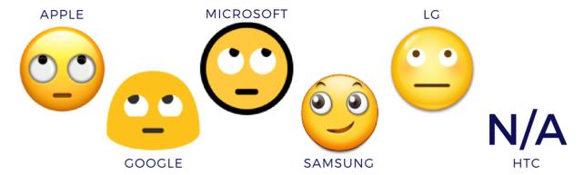 三星又不按套路出牌了,搞个萌妹大眼是什么鬼?而HTC更是直接没有这个表情。