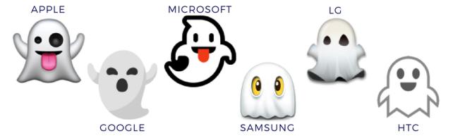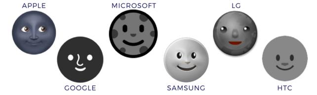 在访问Emojipedia之后,我花了几个小时浏览表情符号的变化,我意识到表情符号的设计极大地影响了我们使用和解释它们的方式。苹果、三星、LG、Google、微软和HTC等平台供应商在智能手机上使用自己的表情符号图像和设计。最应该警告大家的是:令人毛骨悚然的黑色月亮表情符号在每个平台都不一样。