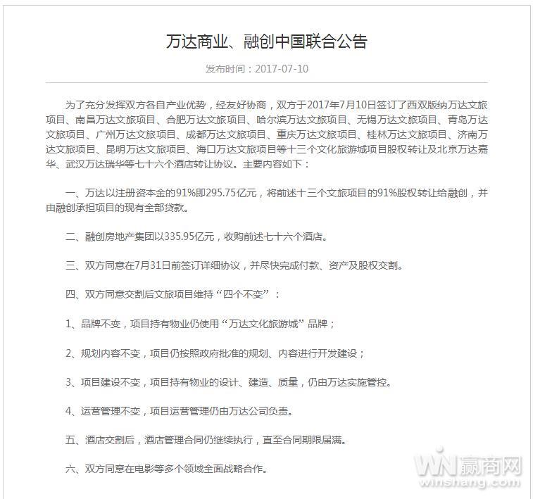 7月10日早上,万达集团在其官网上发布公告称,已与融创签订转让协议,把其旗下13个文旅项目及76个酒店转予融创,总作价631.7亿元。具体协议部分如下: