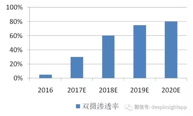 最近一个快速渗透的例子就是双摄像头,自iPhone7推出以后,双摄已经成为高端手机的标配,其渗透速度也经历快速爆发,即使在手机增长放缓的背景下,舜宇、大立光、丘钛等相关公司也实现了戴维斯双击。