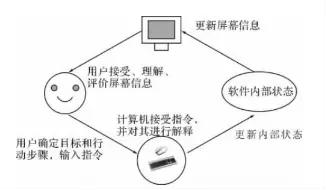 Norman D.提出了适用于所有WIMP界面(W-windows、I-icons、M-menu、P-pointing device)的电子游戏交互环(Interactive Circle)模型(见图2)。其基本的循环过程是: 软件程序通过输出设备输出系统目前状态,用户对目前得到的状态进行分析(a),如果需要改变目前系统的状态,就通过输入设备将指令信息输入(b),软件系统则接受 /理解 / 评估这些指令(c),然后改变自身的内部状态(d),最后通知输出设备更新显示信息(e)。至此,一个循环完成,用户看到更新的信息,知道系统状态已经改变。 如果需要, 用户可以再次启动另一个循环。