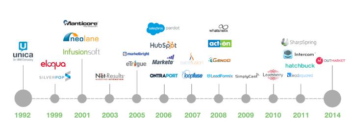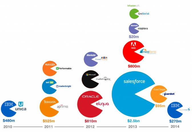 在营销自动化领域,2010-2014年间发生的收购案总价值超过55亿美元。一系列的并购让大型企业市场被Salesforce,Oracle,IBM和Adobe等几家巨头公司占据,但中小企业市场还没有出现几家独大的现象。营销自动化初创公司的领导者Infusionsoft和Hubspot目前更专注于开拓和扩大中小市场的盘子,而非抢占现有的存量市场。