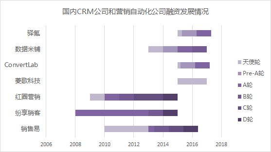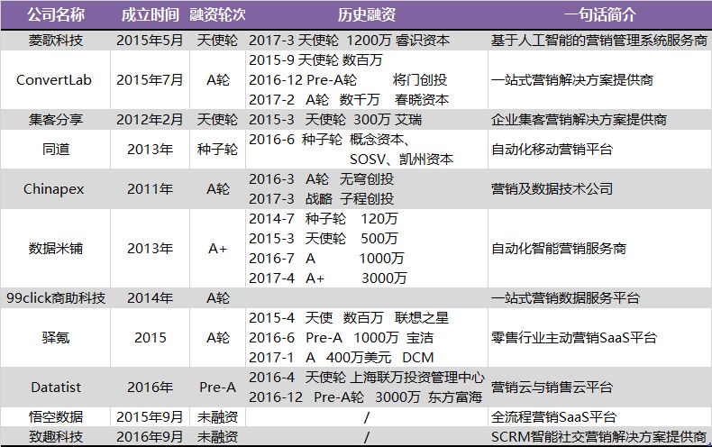 注:其中红圈营销、纷享销客、销售易是CRM服务公司,菱歌科技、ConvertLab、数据米铺、驿氪是提供营销自动化服务的公司。