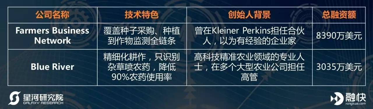 覆盖了大部分农业生产环节的科技公司Farmers Business Network从全美超过1400万英亩的耕种地收集数据,并追踪收成、播种密度、施用时间、价格和其他关于种子、化学药物和农业产品的变量,通过数据分析找到合适的原料投入量,降低种植成本。该系统还包括无人机、卫星、移动app、传感器和地面摄像机等设备的应用,农民上传的作物数据能够自动生成报告,用户可以通过对比找到有效的新技术或替代产品。