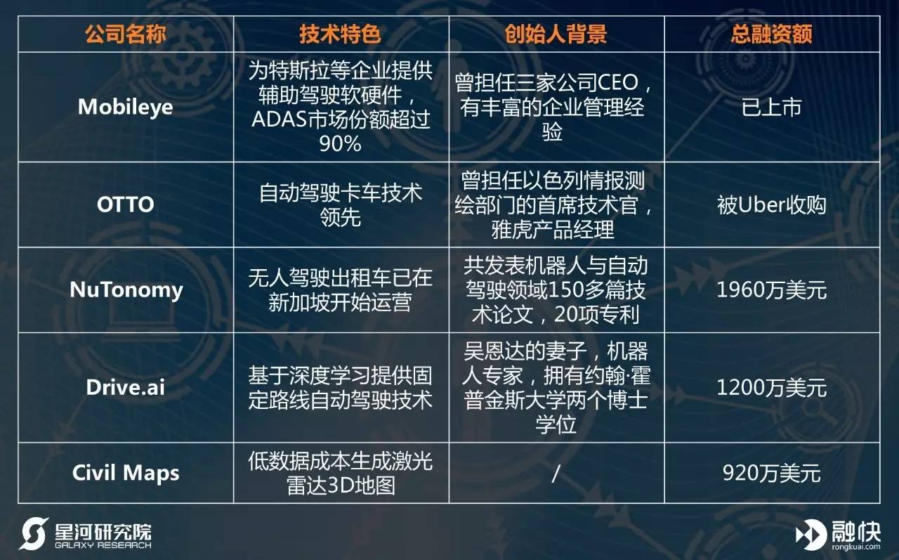 汽车制造与运输行业目前处于变革的高潮期,特斯拉市值对百年车企福特的超越便是一个例证。汽车的电气化、智能化和无人驾驶技术的发展,给这一市场空间庞大的行业带来了极大的颠覆性机会。在这一背景下,围绕自动驾驶产业链的创业企业在不断的崛起和成长,例如以色列公司Mobileye已经垄断了ADAS市场90%左右的份额,自动驾驶卡车开发商OTTO则被Uber收购以占领交通市场先机。