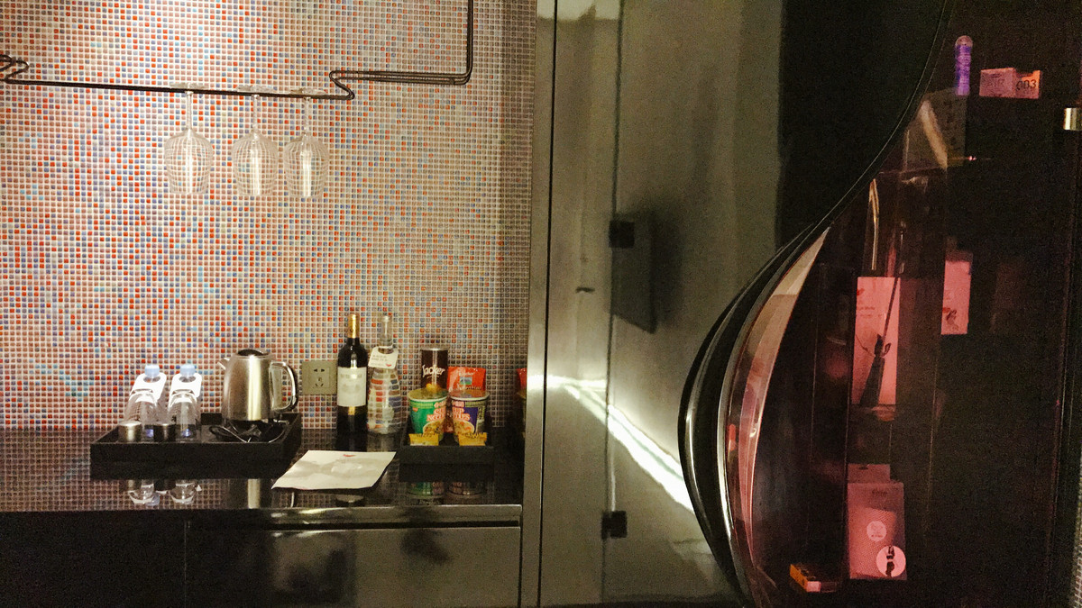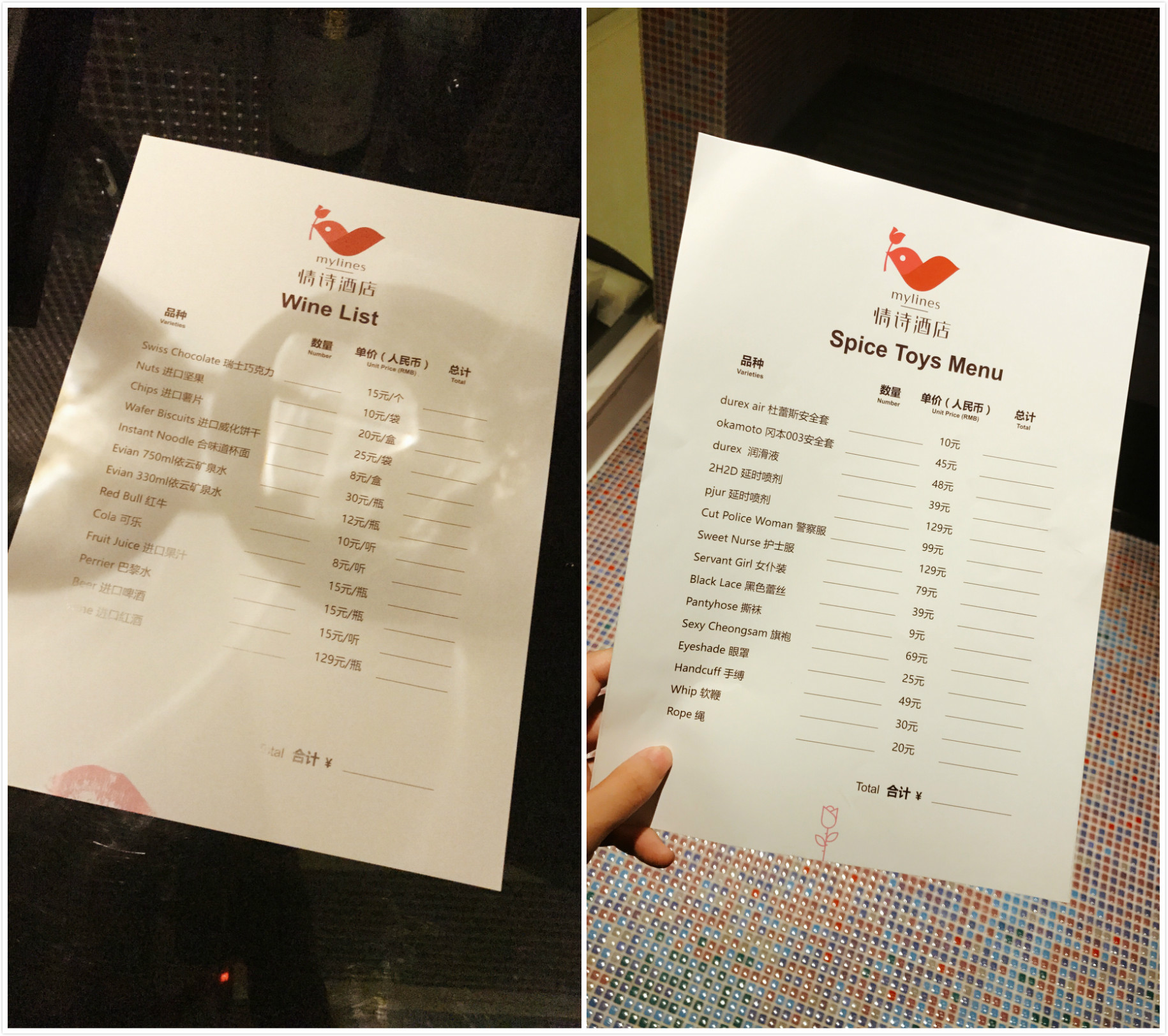 7、零食、饮料(有的放在柜台下的迷你冰箱里)很多都是进口的。此外,情诗酒店为每一间房都配备了情趣用品、道具、及服饰。安全套、润滑液、延时喷剂、警察服/护士服/女仆装、旗袍、丝袜、眼罩、软鞭、绳子等。anyway,进门第一眼就看到了~都是明码标价。