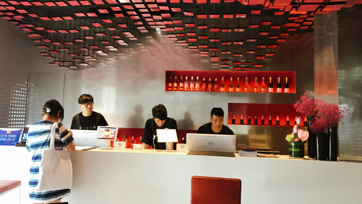 3、酒店大堂位于山下的5号楼(初见楼),走进去是满眼的红色浪漫。前台有多位统一着装的年轻工作人员。前台的平板电脑里,有各种房型的照片,方便客人选择。这个前台也很像酒吧吧台,后面的酒橱里放了很多好看的酒。