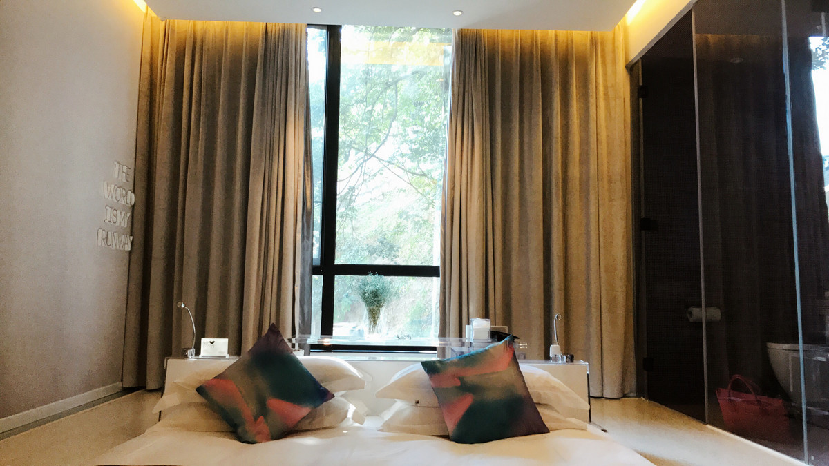 12、用手机把落地窗帘拉开时,窗外是自然之景。据工作人员介绍,情诗酒店的玻璃窗都是使用的特殊材料,里面的人能看见外面,外面看不见里面~so,挑战心理的时刻到了~O(∩_∩)O~