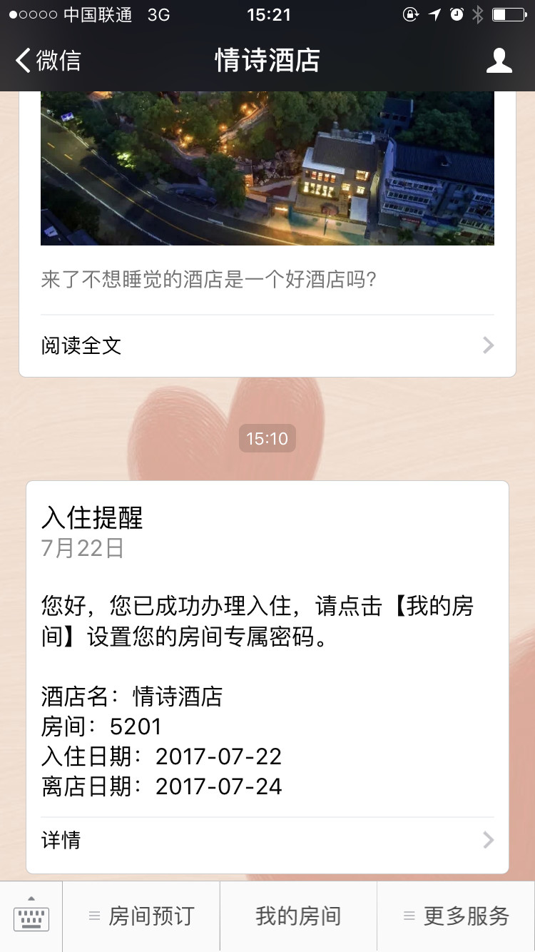 4、选好房间后,工作人员会让客人关注情诗酒店的微信号。订房完成,客人就会收到情诗酒店微信号推送的入住提醒。他们还会让客人扫描平板中的二维码,绑定房间号和开房密码。无房卡的智能入住体验从这里开始了——