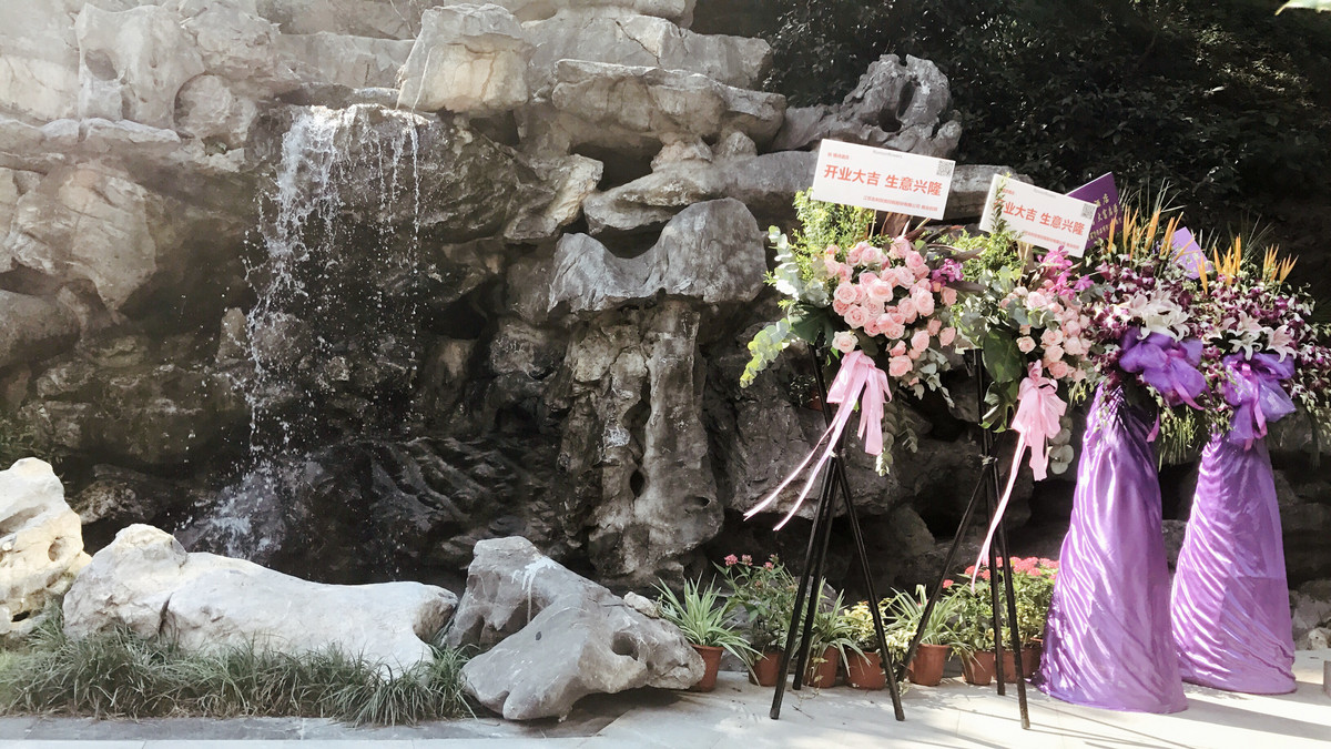 2、推开酒店大门后,迎面便是假山和瀑布。因为酒店处于开业期间,随处可见祝贺开业的鲜花花架,和迎风扑鼻的花香。
