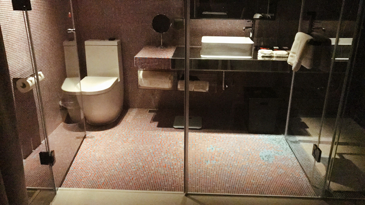 14、房间里的浴室和洗手间,非常干净清爽。这里让人惊喜的,是洗手台上的镜子,给人一种在自家睡觉的即视感。不过,这扇透明的玻璃门却让我撞到了脑袋,好疼。没有“温馨提醒”,有点纠结~~~