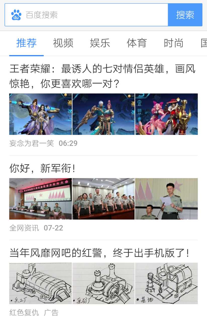 百度于去年下半年正式推出了feed流,在搜索平台上加内容分发产品,百度基本上调用了自己的最大资源去推动feed的建设,包括手百,浏览器和贴吧,都加入了feed流的行列,随后又启动了百家号,从内容生态上去完善,现在我们打开手机百度,也能看到分布在搜索框下面各式各样的新闻。