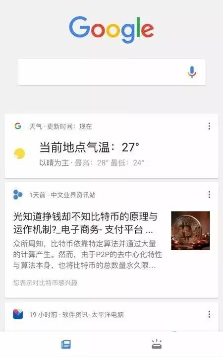新版的 Google 应用底部有两个分区 tab。左边 Google 搜索框的下方有个新增的 Feed 功能。Google 会根据用户的搜索记录提供相应的新闻资讯、而这些数据的来源,除了之前你在谷歌上的搜索历史之外,还包括YouTube观影习惯以及其它谷歌产品能够收集到,关于你个人的兴趣偏好,一次来做精准的新闻推荐。