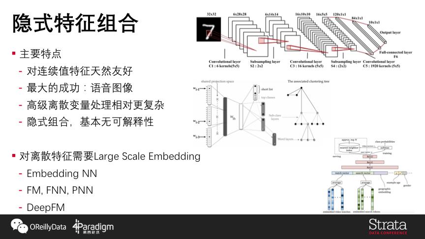 隐式特征组合主要特点是对连续值特征非常友好,最成功的应用场景是语音和图像。在这些原始信号是像素或是声波的问题里面,深度学习通过神经元网络产生底层的Filter以及层次化的特征组合,获得了远超人类手工特征工程的效果。但是深度神经网络并不是万能的,在深度学习中,高维离散特征的变量处理非常复杂,同时缺乏可解释性,过于黑盒化也是神经网络大家关注的焦点。这样会导致深度学习出来的特征组合相对难用到其他算法之上,也很难给人明确的信息反馈。