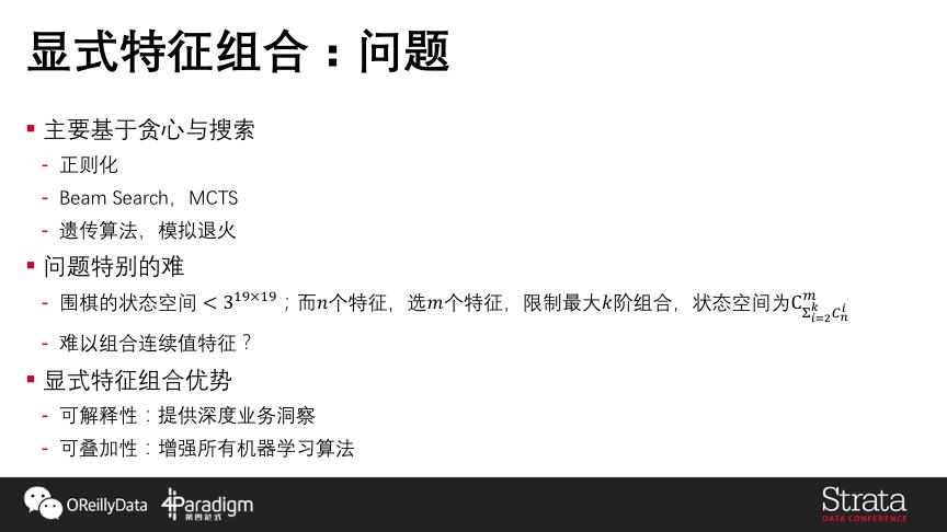 第三个介绍一下显式的组合,算法的输出会明确指定哪些特征组合起来(笛卡尔积)作为基础特征。整体思路沿着搜索与搜索优化这条路,也有一些地方使用正则化加贪心。由于显式特征组合的问题求解空间大,寻找最优特征组合是个非常难的问题。我们对比AlphaGo下围棋,19乘19的棋盘上每个点上有黑子/白子/无子三种状态,它的状态空间最大是。考虑显式特征组合要做的事情,我们要有个特征,限制高阶组合阶数不超过,从中选取个特征,那么2到特征的总量是,最终再从其中选取个特征,其空间是 ,即使将不大的中带入,量级会远远大于,从解空间大小的角度看显示特征组合比下围棋还要更难。
