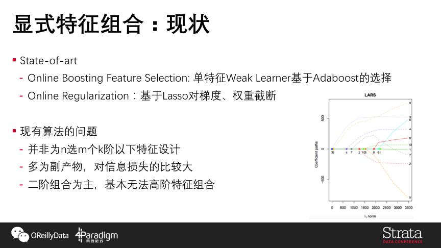 目前,显式特征组合主要有几种算法,一些方法基于Boosting,训练单Feature弱分类器,通过Boosting的过程寻找组合的启发;或者基于Regularization进行权重截断,形成组合候选。这些算法一般不是为了特征组合而设计,组合也多为训练过程的副产物,很难真正的获得高阶的组合特征。