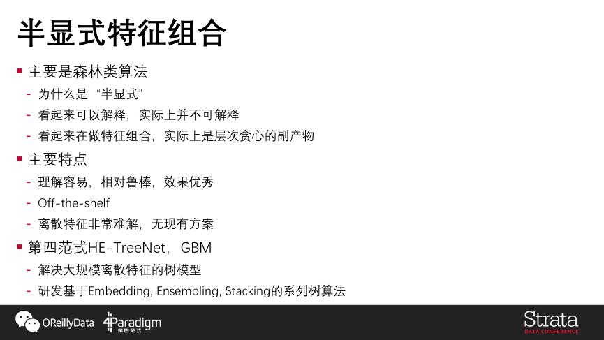 第二个是半显式的组合,主要基于的是树模型。为什么说是“半显式”呢?因为大家可能认为树模可解释或者做特征组合是很自然的事情,但其实并不是:叶子节点的每一个分支并不是一种显式、直接的特征组合,而是这些特征在特定取值区间的组合。所以从结果上来说我们做到了特征组合,有一定可解释性,但是同样也没有办法直接看特征相关性或者特征之间组合关系。作为非线性模型,树模型主要的特点是容易理解,效果也是非常好的。但是类似的,它对离散的精细特征非常难处理,传统上训练一棵m个特征n个训练数据k层深t棵树的模型需要O(mntk)的时间,即使对系数特征进行优化,也很难降低特征分裂中分桶上的空间与传输消耗。在这个方面,第四范式提出了一系列算法,包括HE-TreeNet和GBM系列算法,通过Embedding,Ensemble、Stacking,General Boosting等方式让树模型可以在大规模特征的情况下可以进行特征组合。
