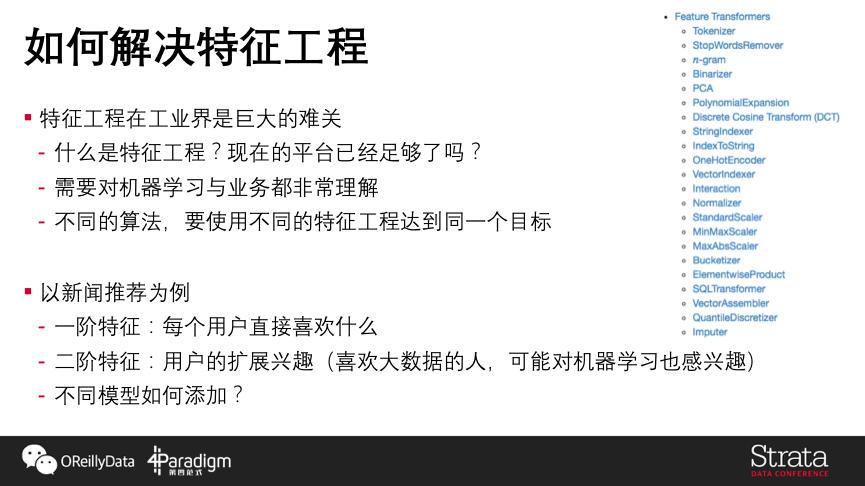 如何降低这些门槛呢?这里分享一下第四范式的成果。首先特征工程是工业界应用AI的巨大的难关。特征工程的目标是针对于某个模型找出与要解决问题相关的关键属性,现在也有一些开源的项目尝试解决特征工程,下图就列出了Spark 2.2官方文档中包含的特征工程算法。那么,针对不同的业务、不同的模型,这些算子就足够我们低门槛建模了吗?