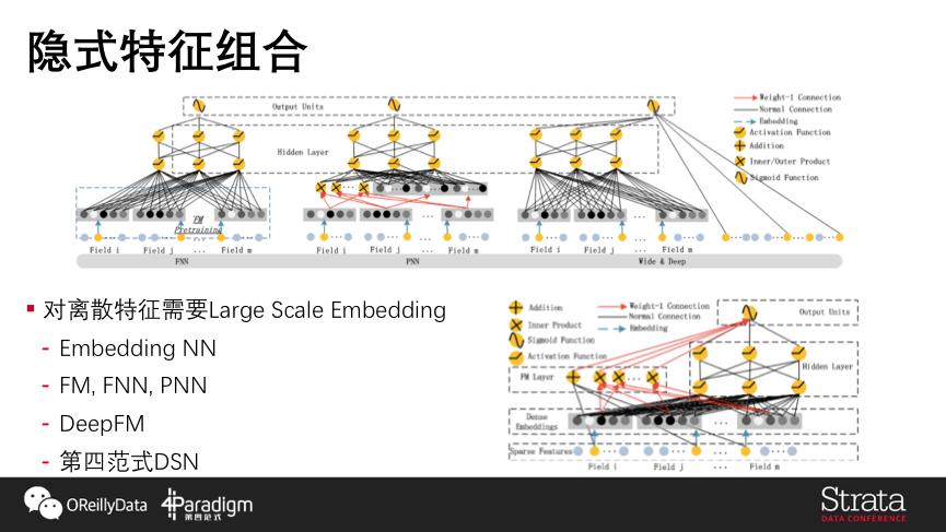 Large Scale Embedding在现在依然是一个比较热门的研究领域,其中的成果包括Discrete Factorization Machine, FNN, PNN, DeepFM等,上图显示了这些算法的异同,简单来讲这些模型既能找到特征之间的推理关系,同时也能去记忆比较细的特征。在这个领域,第四范式提出了DSN(Deep Sparse Network)的算法,它是一个非常宽且深的模型,里面同样会做大规模Embedding,用神经网络做自动学习组合,目标解决高维模型(上万万亿VC维度)的正则化以及并行计算问题。