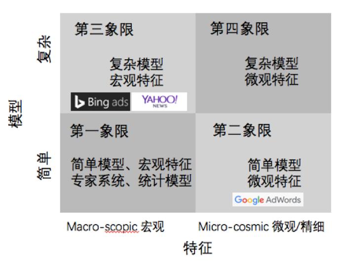 这样就把人工智能分为了四个象限。如上图,左下角是第一象限,使用宏观特征简单模型解决问题。这种模型在工业界应用非常少,因为它特征数少,模型又简单,VC维就是低的,不能解决非常复杂的问题。右下角的第二象限是简单模型加上微观特征,最有名的就是大家熟知的谷歌Adwords,用线性模型加上千亿特征做出了世界顶尖的广告点击率预估系统。左上角的第三象限是复杂模型加宏观特征,也有诸多知名公司做出了非常好的效果,例如Bing广告和Yahoo,经典的COEC+复杂模型在这个象限内是一个惯用手段。最后是第四象限,利用复杂模型加上微观特征,由于模型空间太大,如何计算以及解决过拟合都是研究的热点。