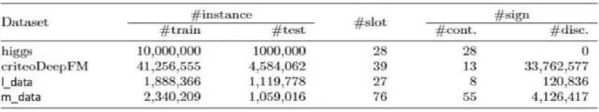 我们在4个数据及上实验了FeatureGO算法,包括两个公开的数据集(higgs、criteoDeepFM)与两个我们私有的数据集(l_data,m_data),数据集统计信息如下: