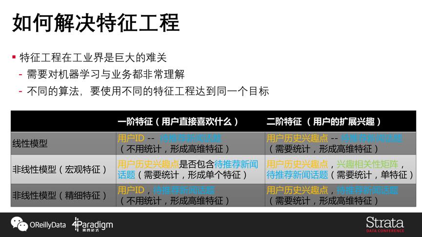 回头看,如何在之前提到的“复杂模型(非线性模型)+宏观特征”这条路添加一阶特征呢?如图左下角所示,由于是宏观特征,我们需要将不同的话题变成单个特征,一种做法是通过一阶逻辑的判断“本篇新闻的话题是否属于用户历史的兴趣”加入。这种方式下,在线上服务的时候,我们除了需要推荐实时信息之外,还需要实时维护用户历史的兴趣点,但是模型本生的更新频率就不用那么快了。毕竟,为了达到推荐时效性目标,要么特征静态、模型特别实时,要么特征实时、模型静态不变。