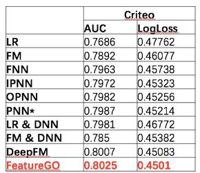 基线对比算法除了LR之外,我们也比较了一些最新的非线性算法成果,在cretio广告数据上进行实验,结果如下。在这个实验里,我们也可以看到,即使是基于最新NN或者FM的特征组合,也并不能找全所有可以利用的信息,这个对比中显式特征组合依然有非常好的表现。同时要注意到的是,FeatureGO产出的新组合特征还可以进一步提高上述所有模型的效果。