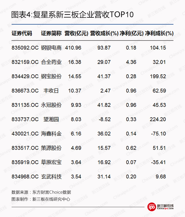 从业绩方面来看,复星所关注的新三板企业多数为新三板上的“顶尖生”。复星系新三板企业中,在2016年实现营收超过10亿元的就有4家,其中复星控股的钢银电商更是以410.96亿元的营收领衔新三板营收榜首。净利方面,合全药业则以4.36亿元的2016年度净利成为新三板企业净利TOP20。