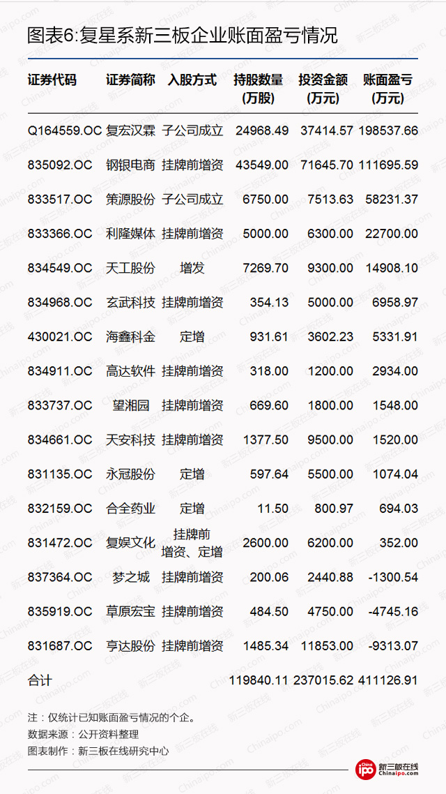 3、 在新三板的布局上,复星系较为倚重互联网和消费升级类的快乐产业。其所参投的挂牌企业财务表现和市场表现均为新三板上的佼佼者,总投资的账面浮盈高达41亿元。