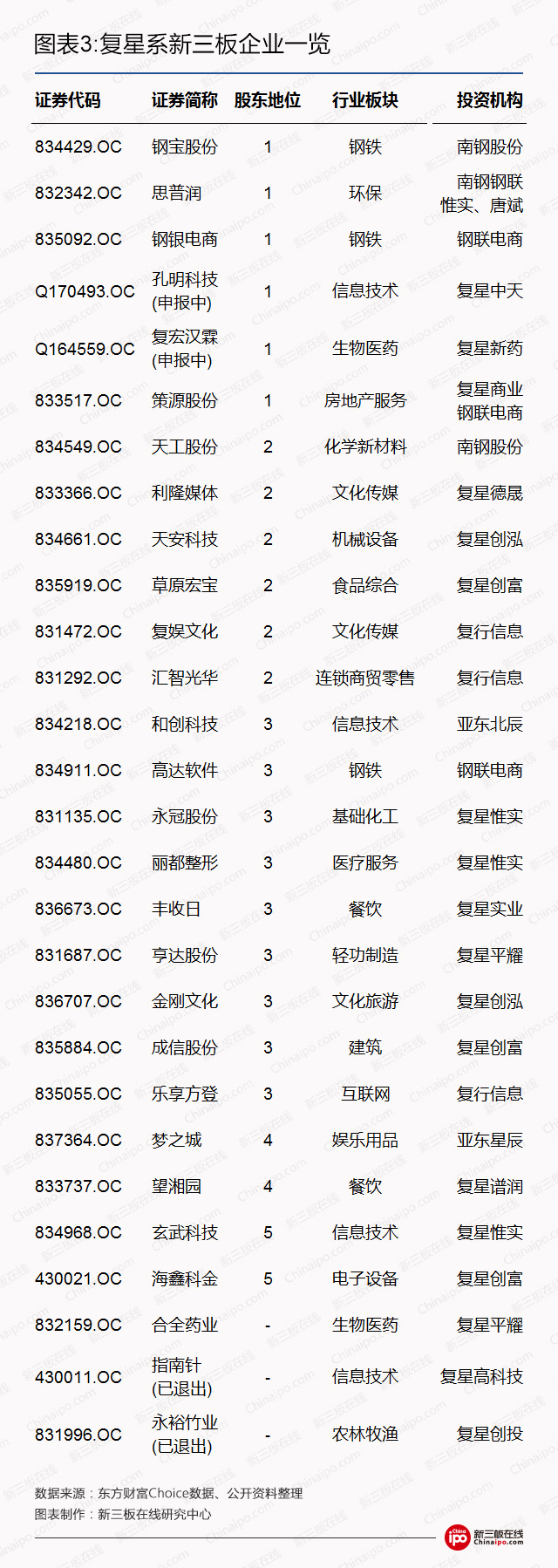 投资渠道方面,复星主要通过旗下复星德晟、创富、亚东北辰等各类平台入驻新三板企业,同时还通过控股上市公司上海钢联、南钢股份等间接入股数家企业。