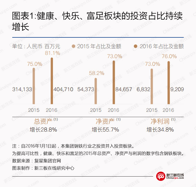 2016年,复星富足、健康和快乐三大板块总资产规模达到人民币4,047.10亿元,占复星集团总资产比例上升至81.1%;净资产达846.57亿元,同比增长55.7%,占集团总净资产的73.0%;净利润达92.09亿元,同比增长34.79%,占集团总净利的76.0%。