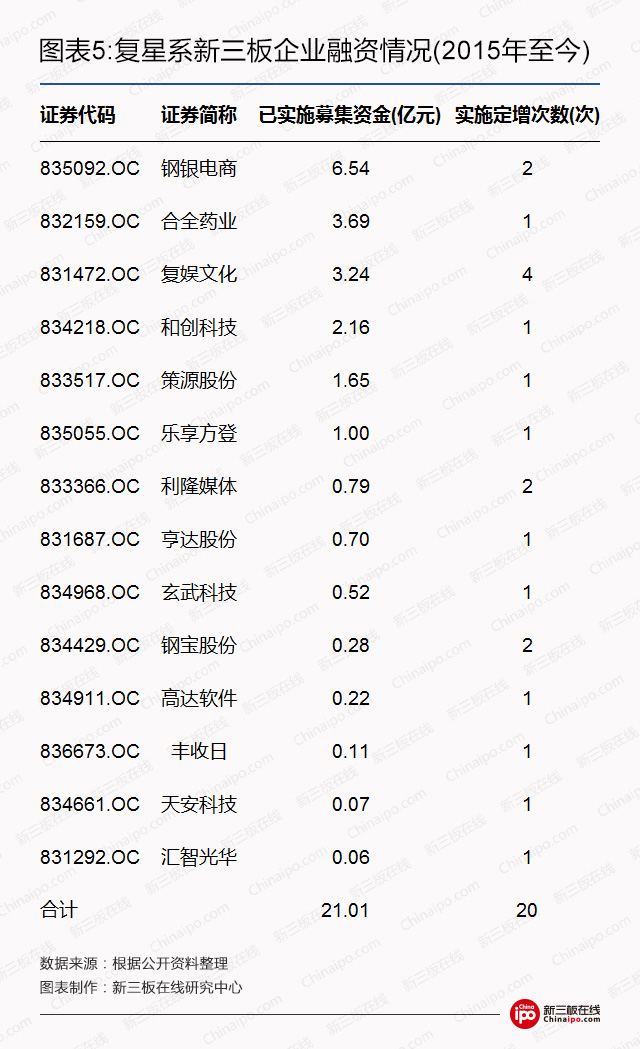 新三板在线研究中心统计,自2015年以来,截至2017年7月19日,14家复星系挂牌企业在复星入股后,于新三板上合计已实施20次定向增发,共募集资金21.01亿元。