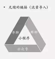 两者的共同点是很轻巧,用了就关,而不同之处在于,在H5页面里,我们买了一个东西关闭它后就找不到它了。在小程序里面,虽然说小程序还是用完即走、用完就关,但是我们有无数的入口可以找到它、搜索到它——可以在发现小程序里面去找到它,可以在公众号里面去找到它。小程序用完就关的同时有一个固定的露出,能够持续地到达用户。更重要的是,小程序在用户数据和用户关系(目前是群关系)的层面实现了打通。