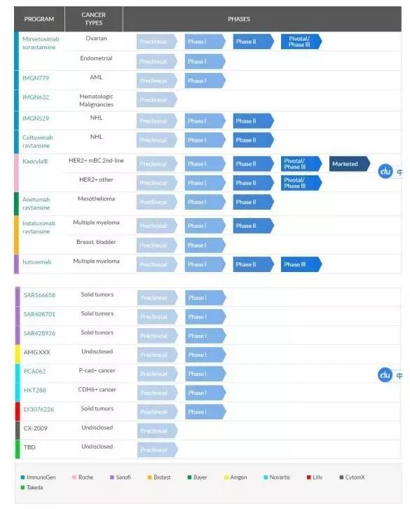 ImmunuoGen是纳斯达克上市企业。ImmunoGen的技术被用于Roche/Genetech的Kadcyla的研发上。其技术授权给了安进、Genetech/Roche、礼来、诺华、萨诺菲和武田。由ImmunoGen或授权技术的主要ADC临床药物有以下一些(部分临床1期药物不算)。