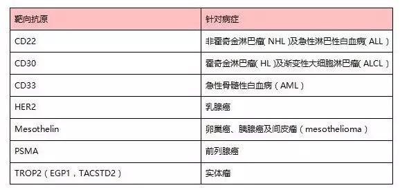 由此可知,CD22、CD30、CD33、HER2、Mesothelin、PSMA与TROP2这7个靶点目前进度较快或较为热门。由此可见其研究风险相对较小,但在目前政策逐渐放开的情况下fast-follow也存在竞争的风险。它们对应的病症如下表。