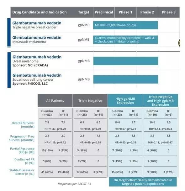抗体药开发公司,纳斯达克上市企业。其ADC临床2期产品Glembatumumab vedotin为GDNMB靶点,全人源抗体,Val-Cit连接,MMAE毒素。其管线及药效如下: