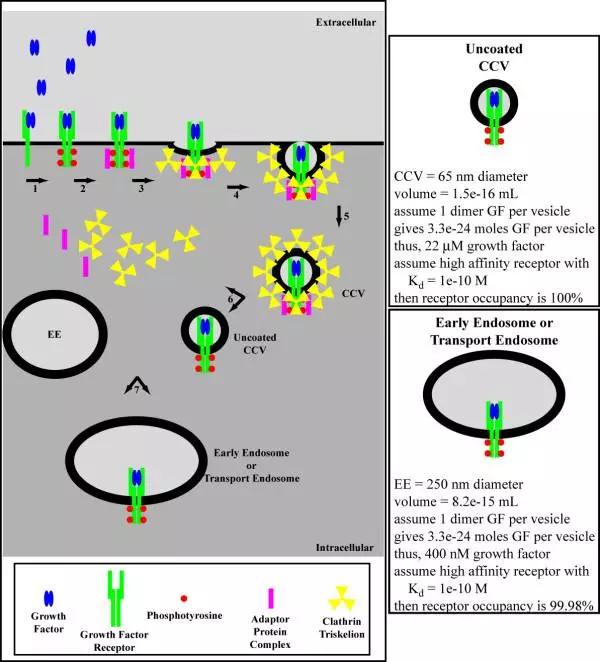 2、从细胞表面至核传到信号,这其中传导信号时需要合成特殊的信号复体complexe的激素较多。许多生长因子是这一类,如EGF刺激EDFR时。下图为EGFR被激活后内吞并运输至细胞核。