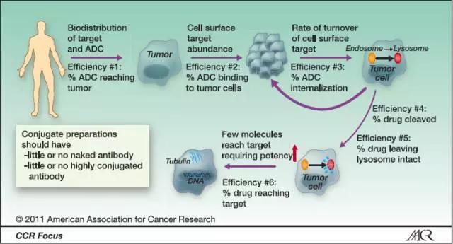 ADC的靶向性来自其中抗体部分(antibody),毒性大部分来自小分子化药毒物部分(payload),抗体部分也可以带有毒性(ADCC与CDC)。抗体部分与化药部分通过连接物(linker)互相连接。抗体部分与肿瘤细胞表面的靶向抗原结合(binding)后,肿瘤细胞会将ADC内吞(endocytosis)。之后ADC药物会在溶酶体中分解(lysosomal degradation),释放出活性的化药毒物,破坏DNA或阻止肿瘤细胞分裂,起到杀死细胞的作用。理想化的连接物应该保持稳定所以不会导致靶外毒性(off-target toxicity),并且在细胞内高效释放毒物。