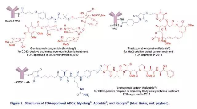 下图为已经或曾经上市的全部3款ADC药物Mylotarg、Kadcyla与Adcetris的分子式。其中,黑色部分为抗体,蓝色部分为连接物,红色部分为毒素。