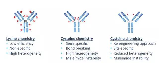 - 一般通过半胱氨酸残基cysteine residue(使用disulfide interchain bridge)或者赖氨酸残基lysine residue(使用epsilon-amino group)连接至抗体上