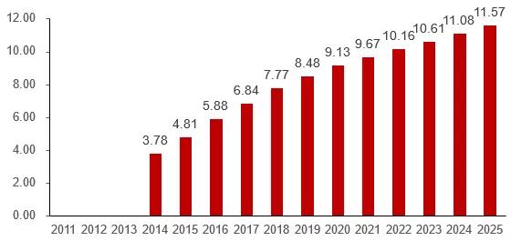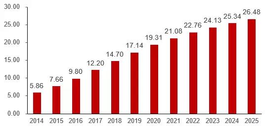 Kadcyla在2013年上市,2014年销售额即达到5.86亿美金,预计2017年可突破10亿美金销售额,到2025年,达到26亿美元,销售前景广阔。其全球销售情况及预测如下图。(单位:十亿美金)
