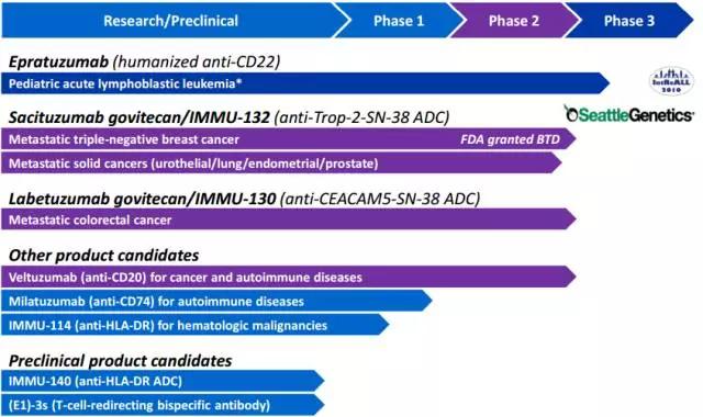 ImmunoMedics是纳斯达克上市企业,负责抗体类药品,拥有商品一种在欧洲上市的放射性抗体用于癌症检测。其向Seattle Genetics授权了IMMU-132,SeattleGenetics将在3年内逐渐拥有ImmunoMedics9.99%的股权。其产品管线如下。