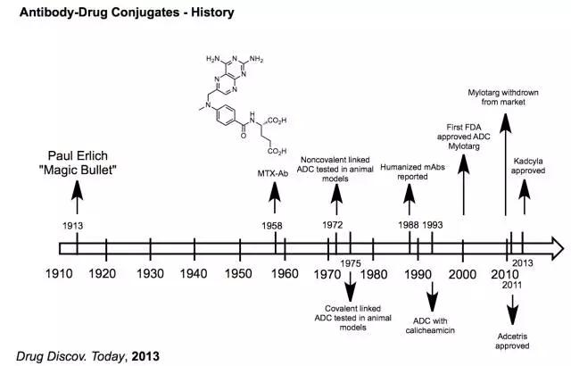 ADC的概念最早始于德国医学家、诺贝尔奖得主Paul Erlich在1913年的Magic Bullet设想(指选择对付致病机体的化合物,始于对梅毒治疗方法的设想)。